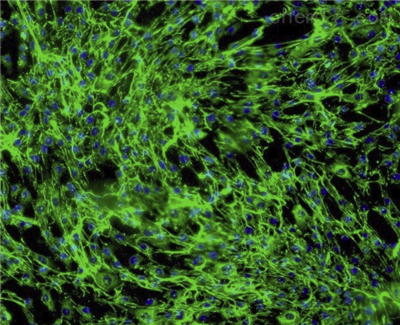 来自ScienCell研究实验室的HHIRSC是从人类头皮中分离出来的。HHIRSC在P0冷冻保存并冷冻。每个小瓶含有>5×10^5个细胞,1ml体积。HHIRSC的特征在于它们的间充质细胞形态和用纤连蛋白和CD105特异性抗体的免疫荧光。HHIRSC对HIV-1,HBV,HCV,支原体,细菌,酵母和真菌均为阴性。在ScienCell研究实验室提供的条件下,HHIRSC保证进一步扩大10次人口倍增。